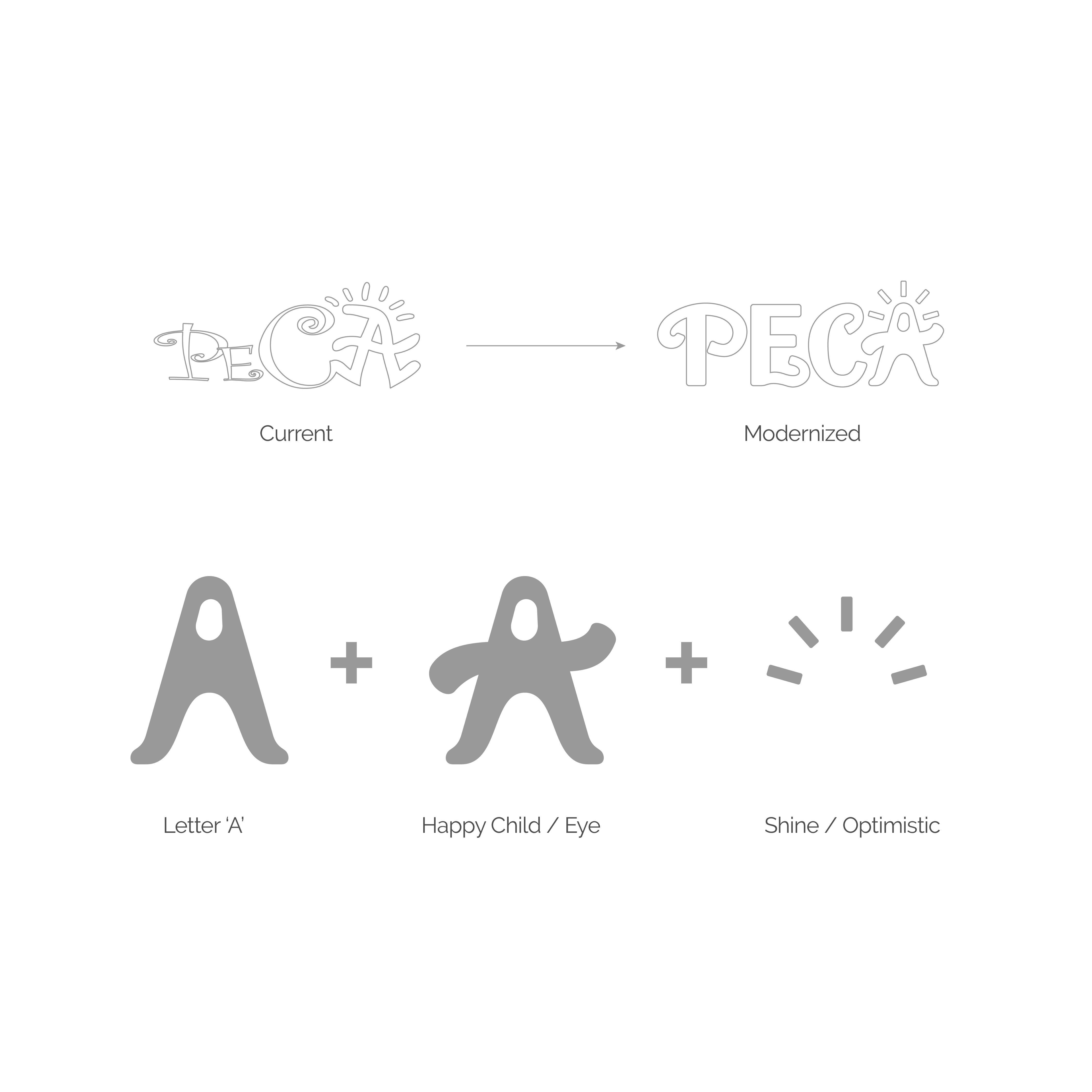 Dieses Logo-Konzept ist eine moderne und zugleich respektvolle Weiterentwicklung des bisherigen PECA-Schriftzugs. Die Wortmarke basiert auf einer individuell angepassten, klaren und schnörkellosen Schrift. Charakteristische Rundungen aus dem Original wurden dezent und bewusst übernommen, um die Wiedererkennbarkeit zu bewahren. Die Buchstabenformen wurden gezielt harmonisiert und vereinfacht, um die Lesbarkeit zu verbessern und dem Logo eine zeitgemässe Klarheit zu geben, ohne den ursprünglichen Charakter zu verlieren. Das ikonische „Zwinker-A“ bleibt erhalten und symbolisiert das freundliche Auge oder den offenen Blick eines Kindes.